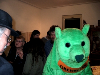 Dann wäre da noch dieses wolfsähnliche Wesen, das aber durchaus menschliche Hände und Füße hat, sozusagen lebensgroß, mit einem Fell aus Pferdehaaren ausgestattet, das voller Elan von einer Stuhllehne aus auf uns zustürzt und, weil es so groß und tatsächlich existierenden Säugetieren so ähnlich ist, als Mittler zwischen dem Ausstellungsbesucher und dem ausgestellten Kosmos fungiert.