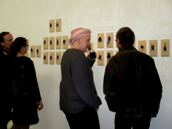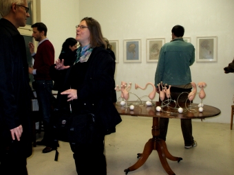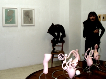 Die plastischen Arbeiten werden ergänzt durch eine Reihe von Farbstiftzeichnungen, in denen nun schließlich auch menschliche oder zumindest menschenähnliche Figuren auftauchen. Doch auch sie erscheinen seltsam gefährdet: Nackt, teilweise skelettiert, dann wieder mit obskuren fragilen Auswüchsen versehen, die sowohl als Hirngespinste aber auch als bedrohliche Wucherungen oder energiezehrende Parasiten (oder sind es im Gegenteil externe Energiespeicher) interpretiert werden können. Der zarte Strich und die sensible zurückgenommene Farbigkeit unterstützen in diesen Zeichnungen den Eindruck der Verletzlichkeit, der diesen Hominiden eignet.